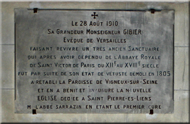L'abbé René Sarrazin - auteur du blason de la ville - déjà connu des Vigneusiens pour enseigner le cathéchisme aux enfants de la commune dans une des salles du Château Frayé, sera le premier curé de cette nouvelle paroisse (en cliquant sur la carte postale, vous pourrez lire les impressions sur l'évêque et le nouveau curé d'une personne présente le jour de l'inauguration). Une plaque toujours visible située à gauche en entrant dans l'église commémore cet événement. Peu de temps après, une salle paroissiale était contruite à proximité du presbytère. |